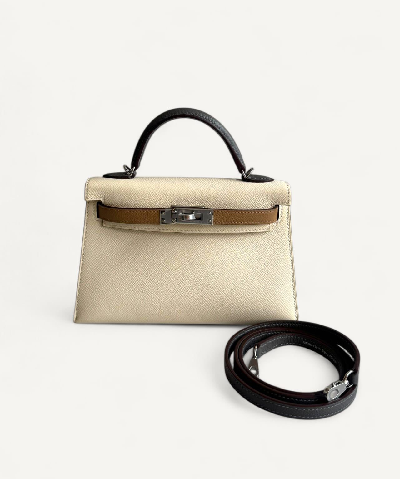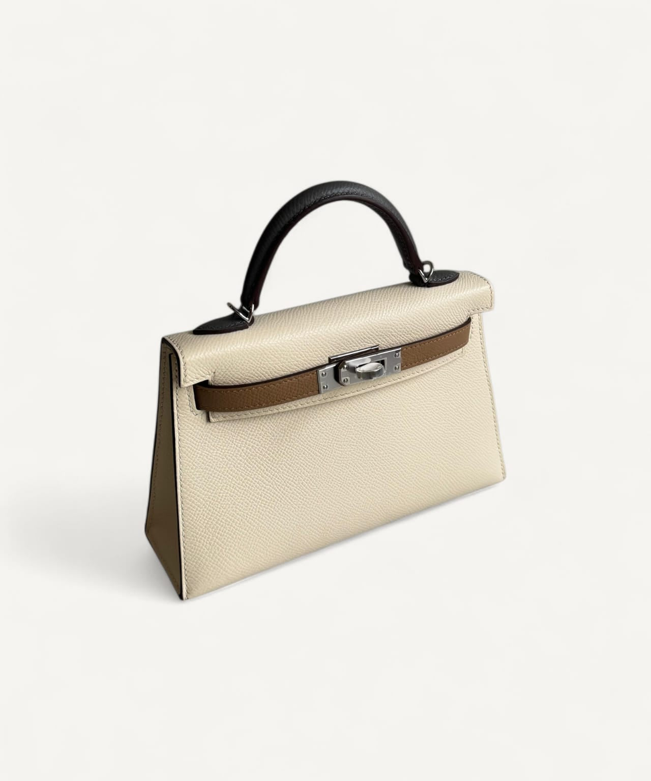 Bolsa Hermès Mini Kelly Epsom Tricolor Nata/ Chai / Gris Meyer com Ferragens Palladium