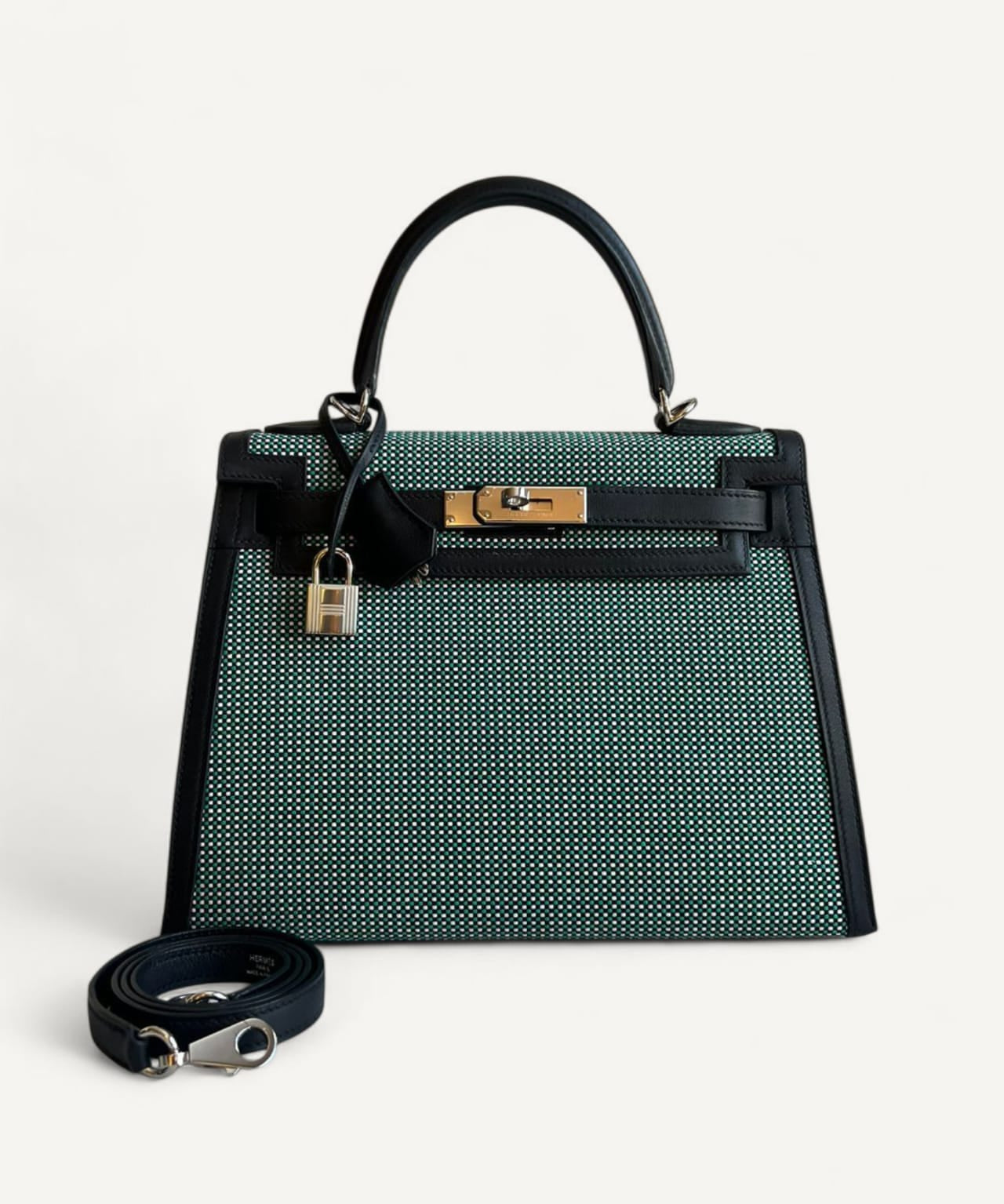 Bolsa Hermés Kelly 28 Toile Quadrille Vert com Ferragens Palladium
