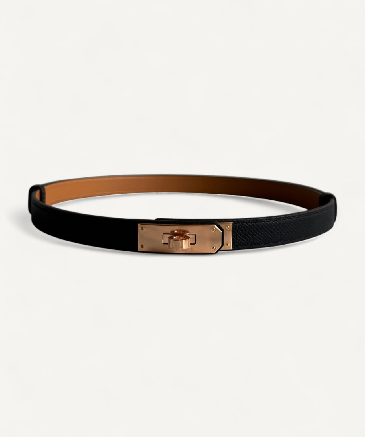 Cinto Hermés Kelly Epsom Noir Ferragem Rosé Gold