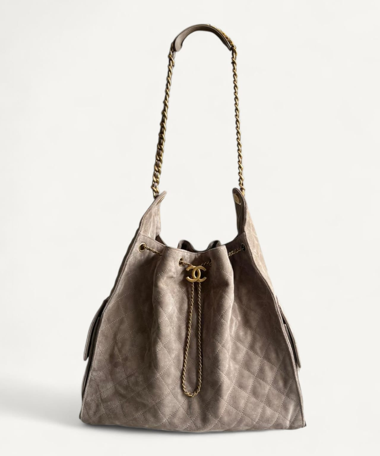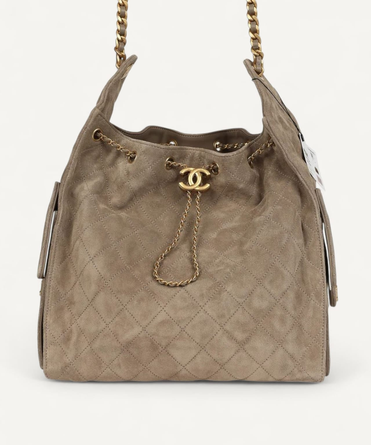 Bolsa Chanel 25 Large Suede Bege com Ferragens Douradas