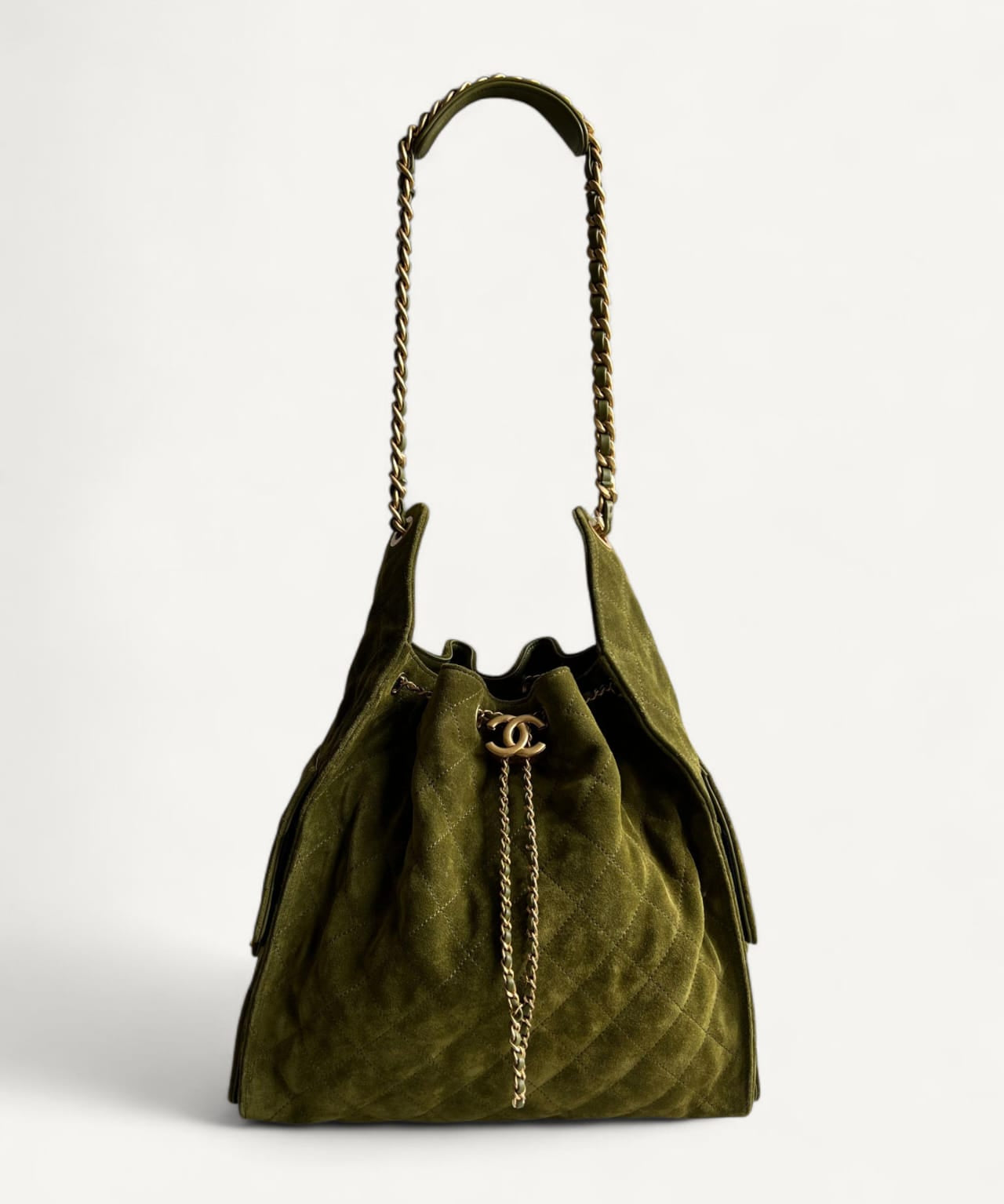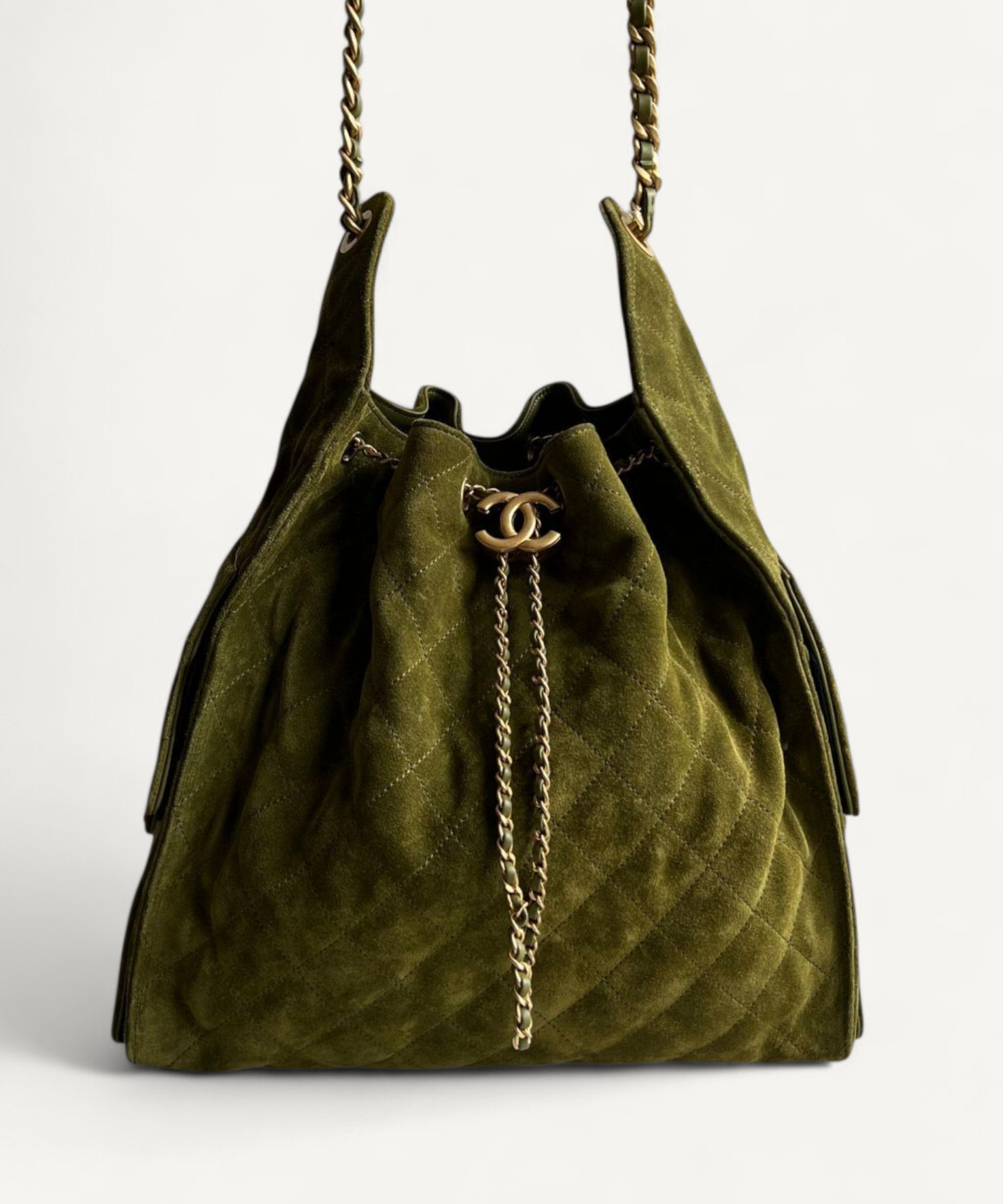Bolsa Chanel 25 Medium Suede Verde com Ferragens Douradas