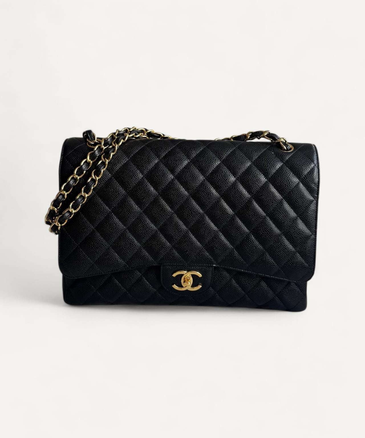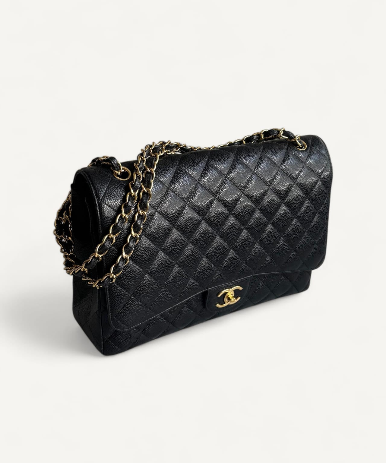 Bolsa Chanel Double Flap Maxi Preta com Ferragens Douradas