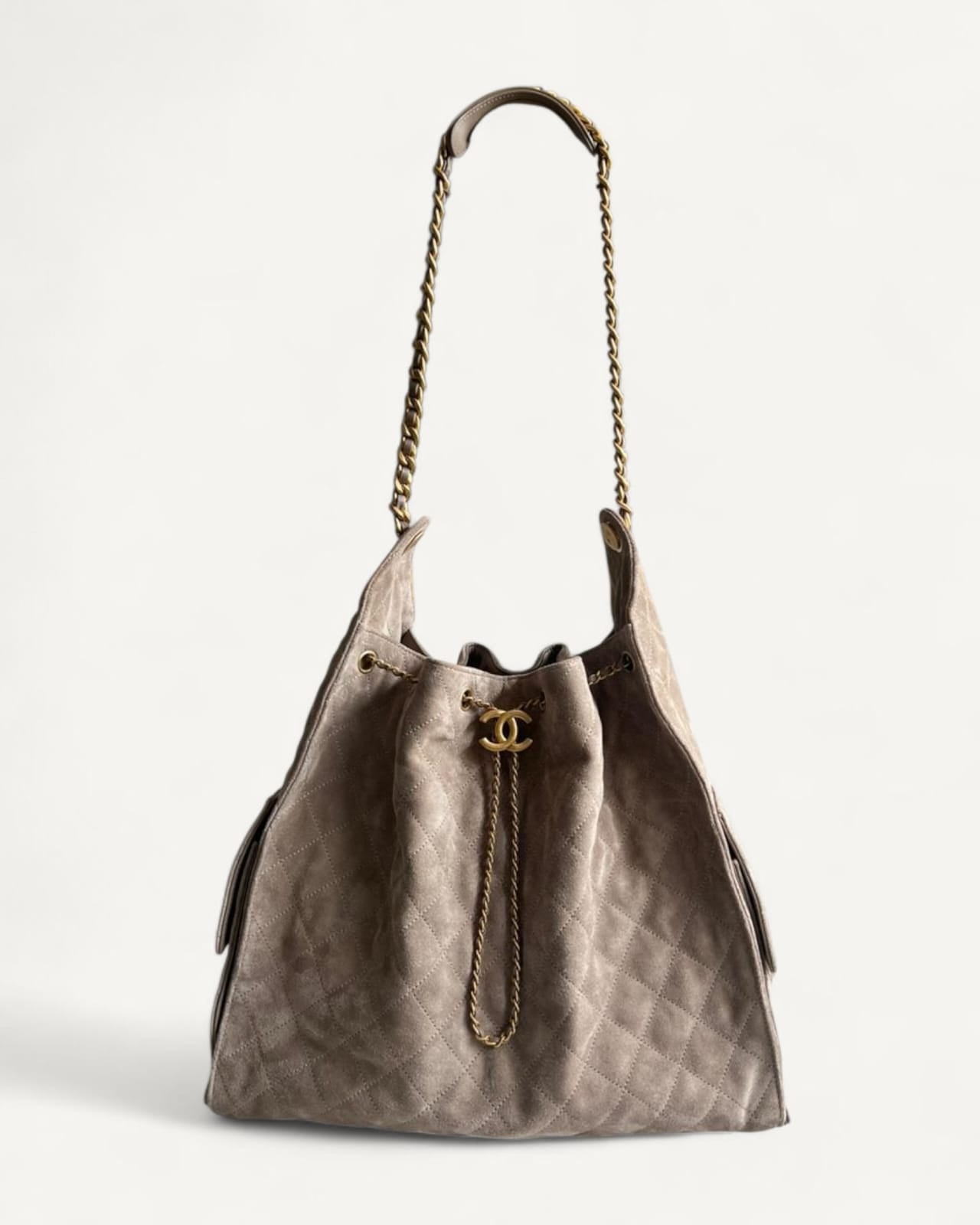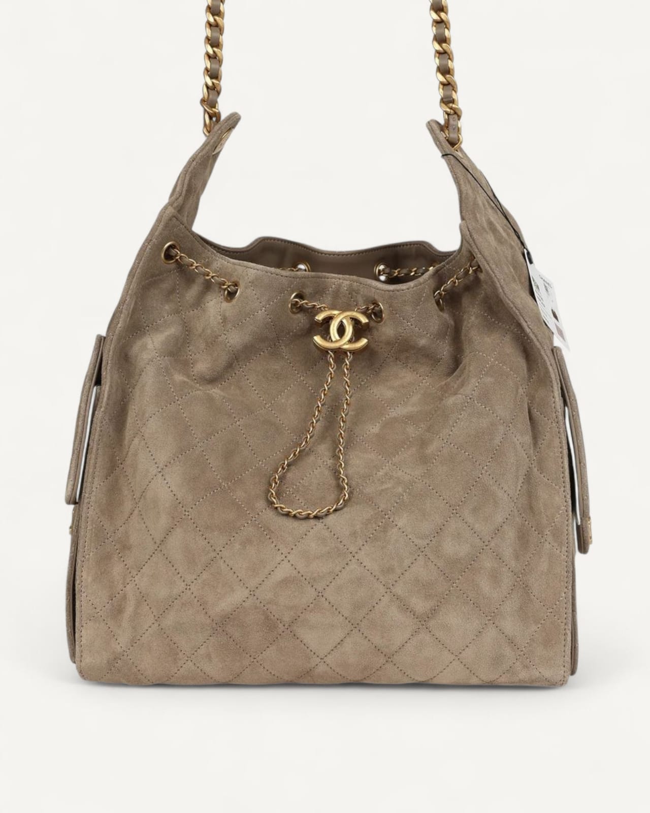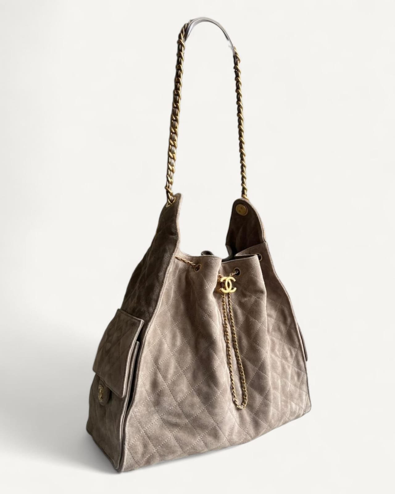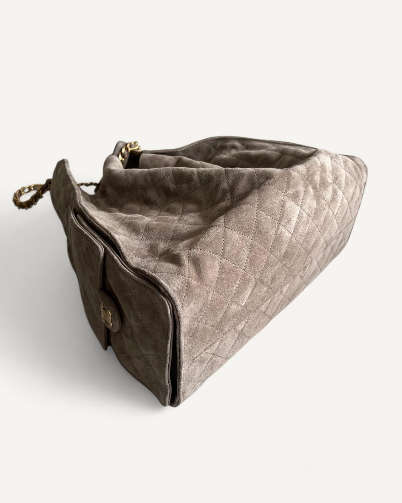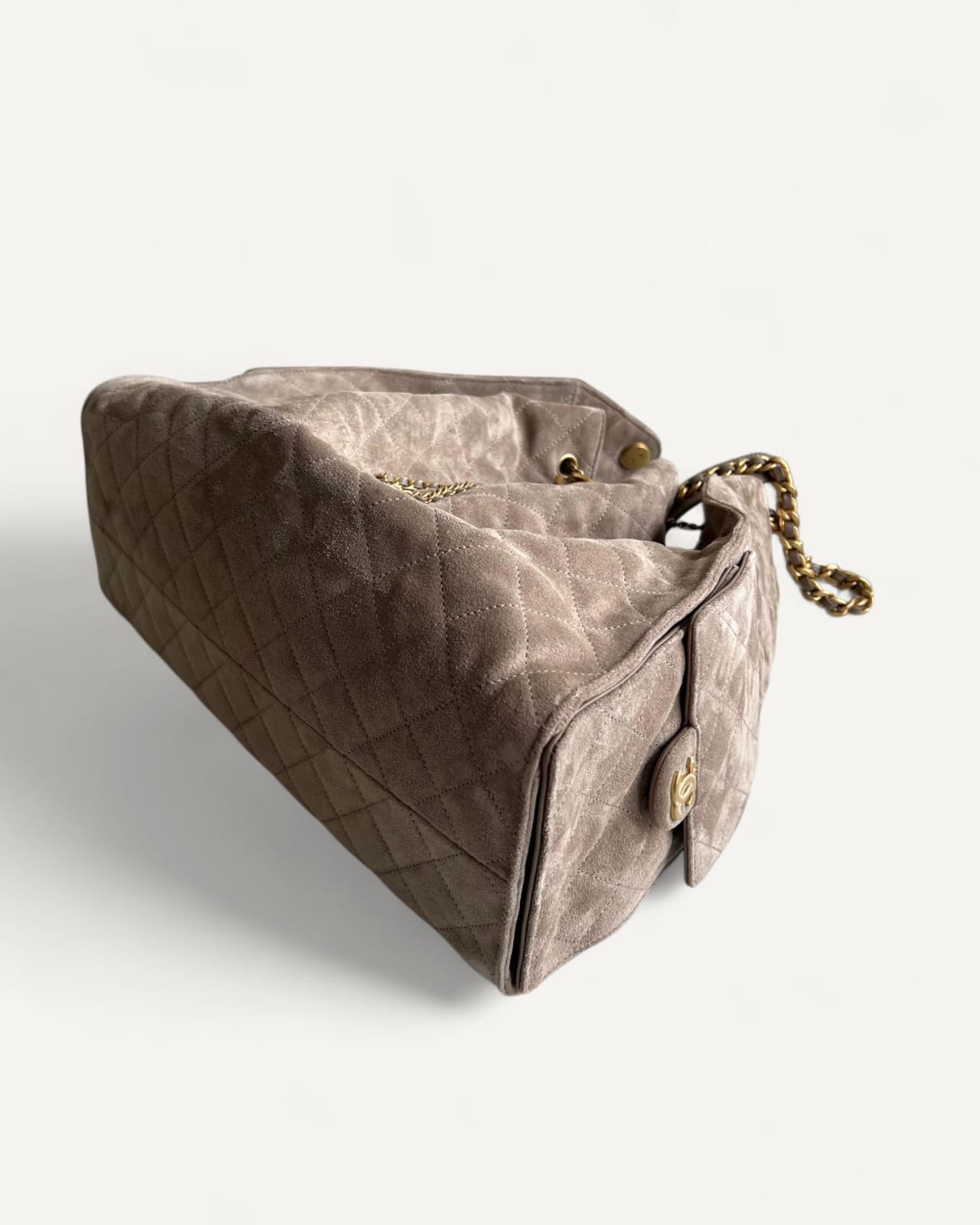 Bolsa Chanel 25 Large Suede Bege com Ferragens Douradas