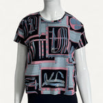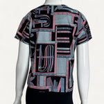 - Estampa em tons de preto, rosa e azul