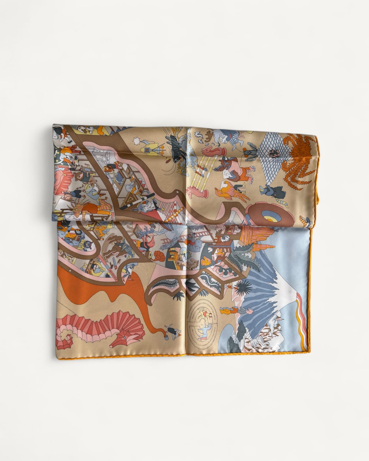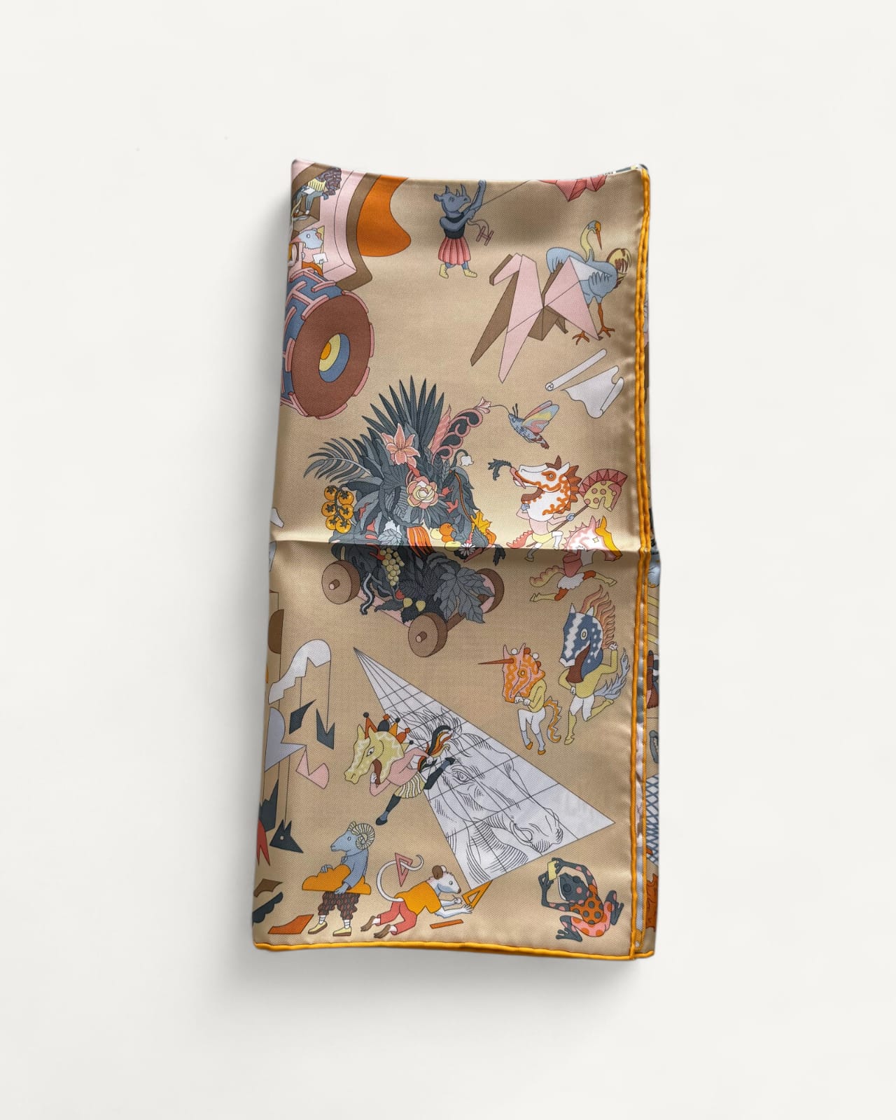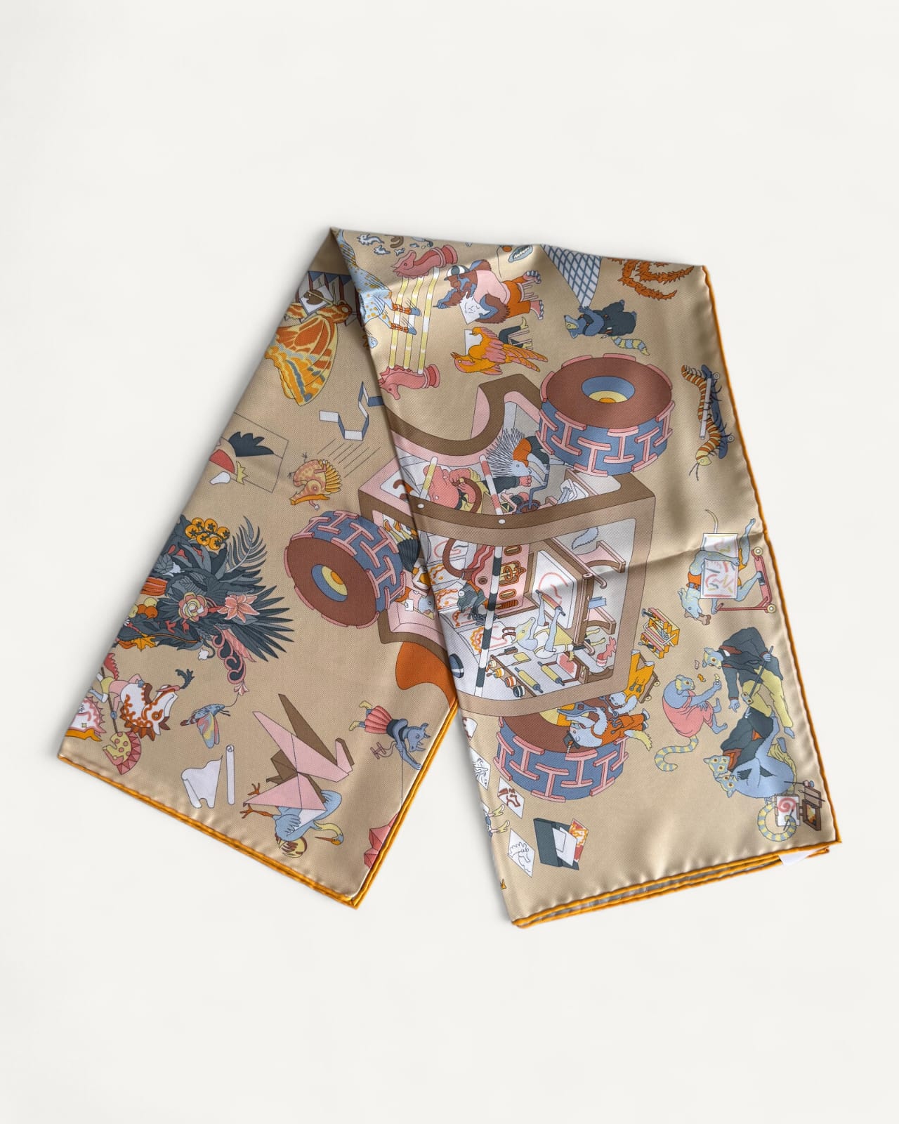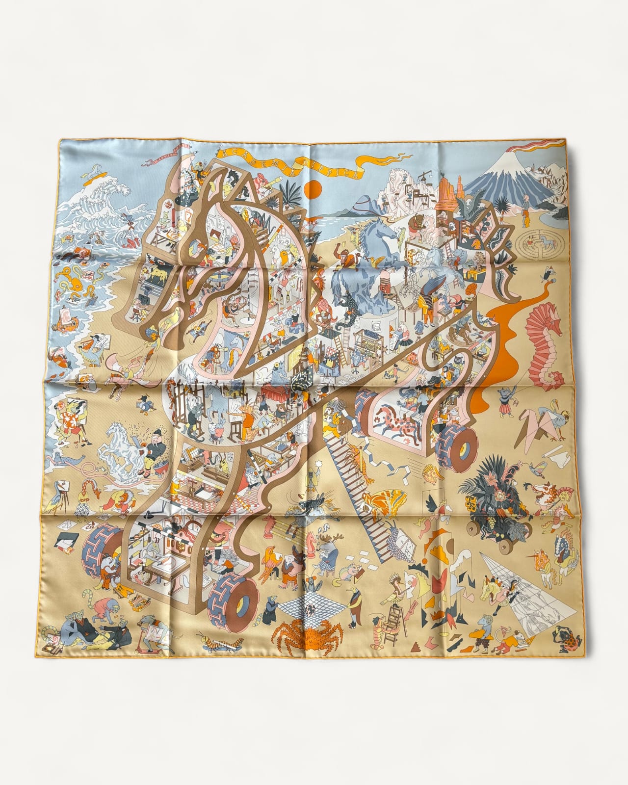 Lenço Hermès 90 Academia Hippica Bleu Glacier / Sable / Bouton D or