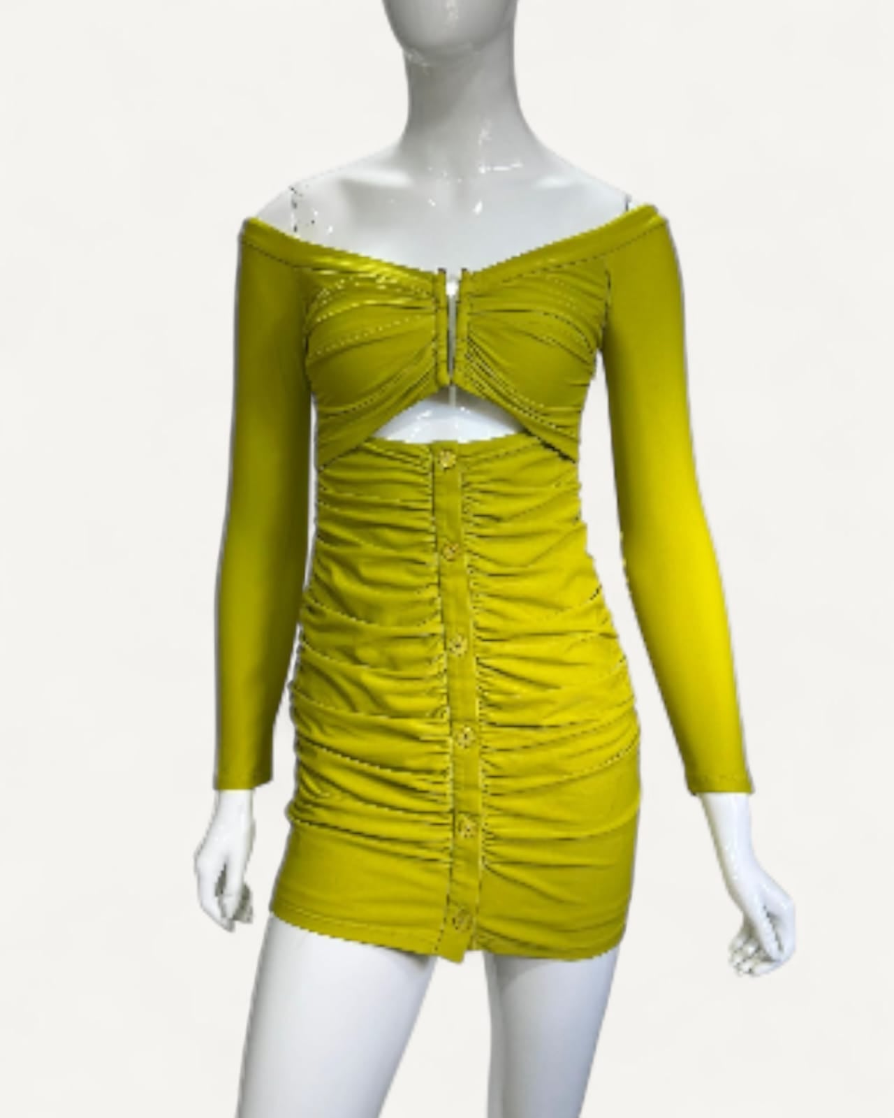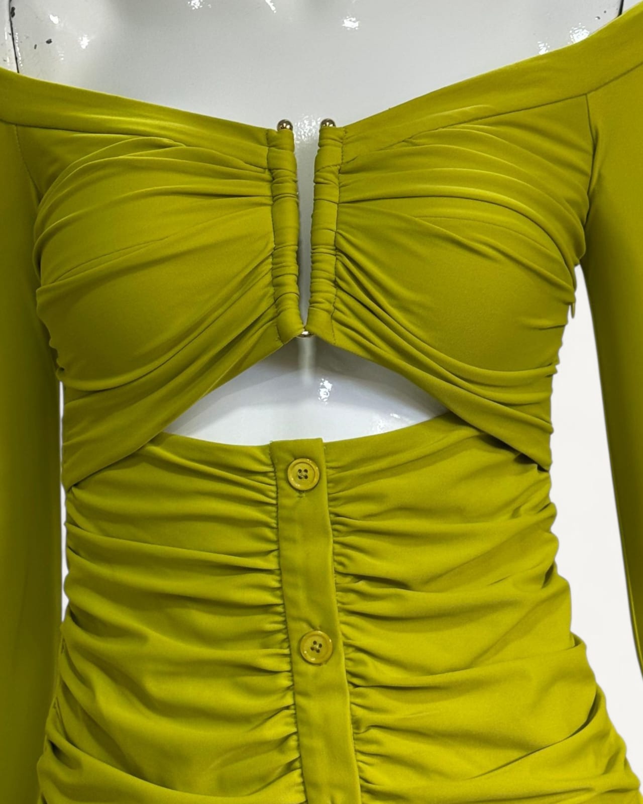 - Detalhe em drapeado frontal com botões